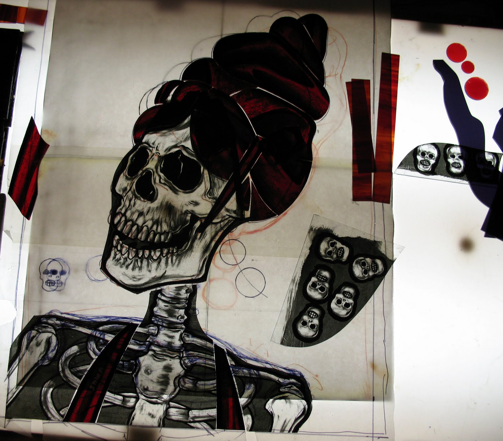 Swinger is one of my bigger windows at over 2 x 3 feet. It was inspired by a muerto streetwalker I have. If I find it I’ll take a picture of it and post it. The thing I love most about the muerto is her pink yarn beehive hairdo. I had some salvaged pieces from a red robe so I cut them down into the beehive and halter top. The background pieces were ruined from brick cleaners spraying acid on them. They were tossed and I rescued them for this window. I painted her head and body along with the miniature skulls for her hair. The dangle earring is made up of 3 glass jewels plated with painted pieces behind them. One fun window. Swinger-2009
